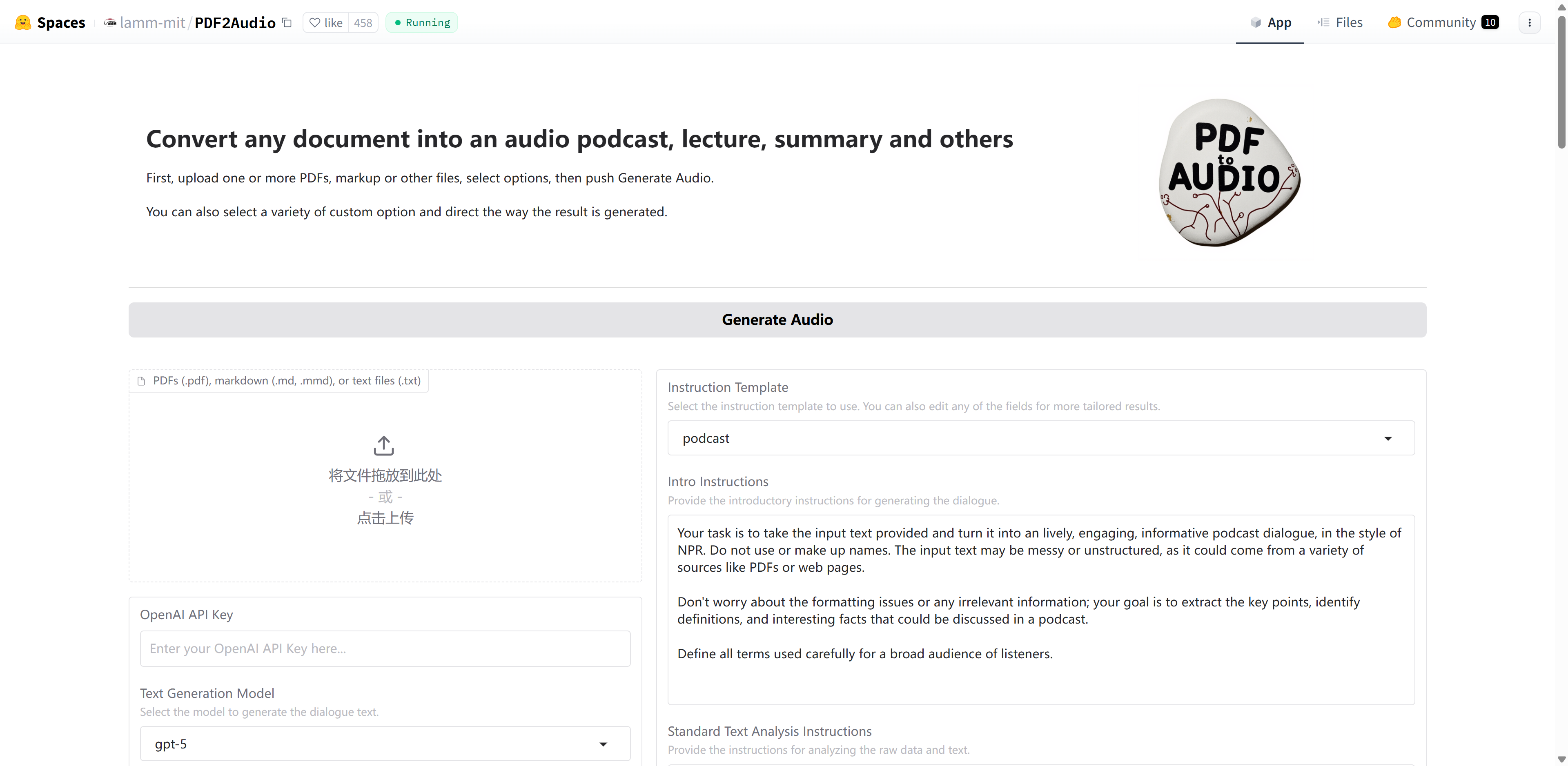 PDF2Audio是一款受到谷歌NotebookLM启发而开发的开源替代品,可以将 PDF 文件转换成音频播客。