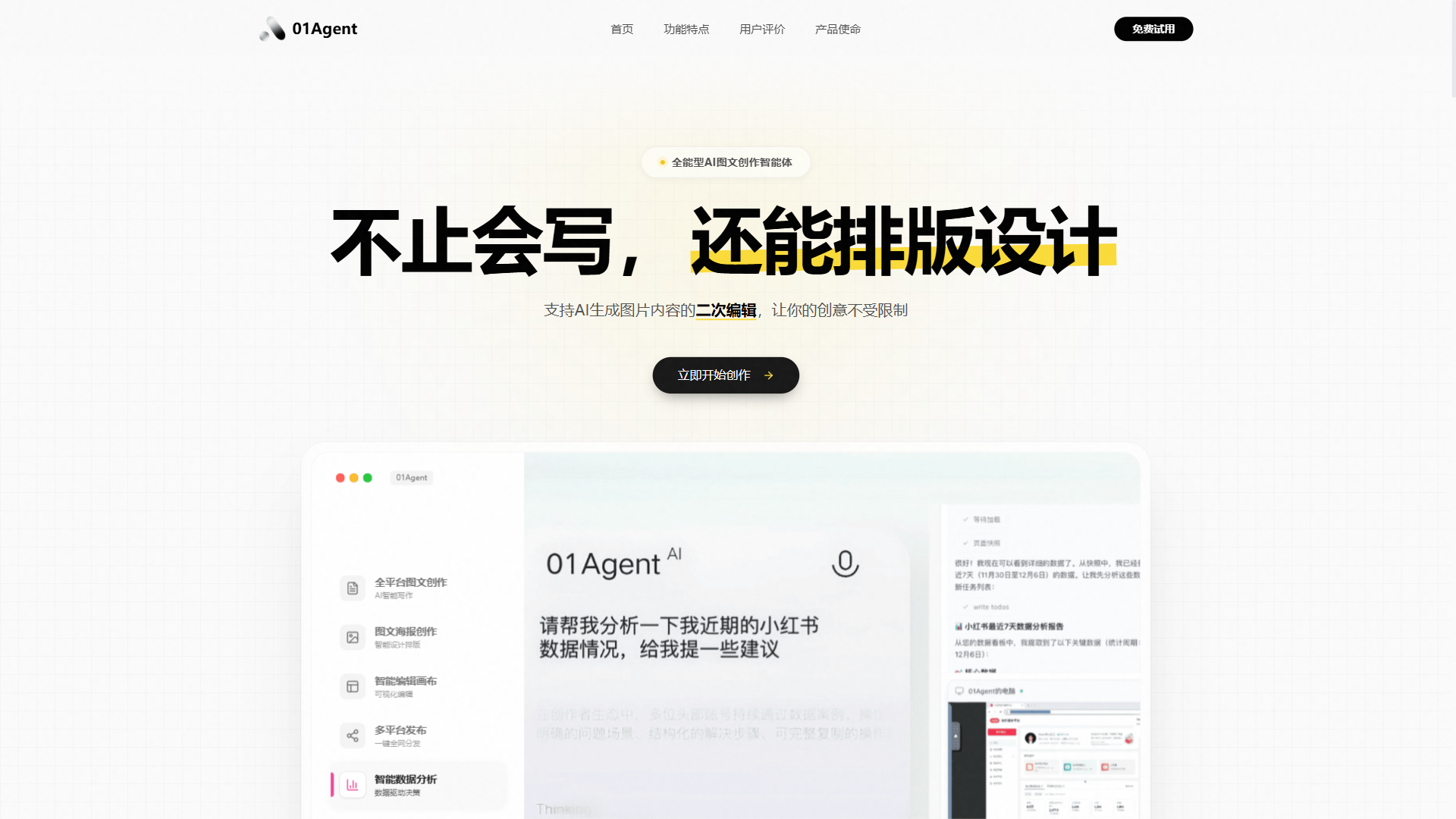 01Agent是一款AI图文创作智能体,支持从内容生成到排版编辑再到一键发布的全流程自动化。平台集成多种AI能力,可根据用户输入的主题自动生成图文内容,并提供专业的排版模板。支持直接发布到微信公众号、小红书等主流平台,大幅简化内容创作和分发流程,适合自媒体运营者和内容营销团队使用。